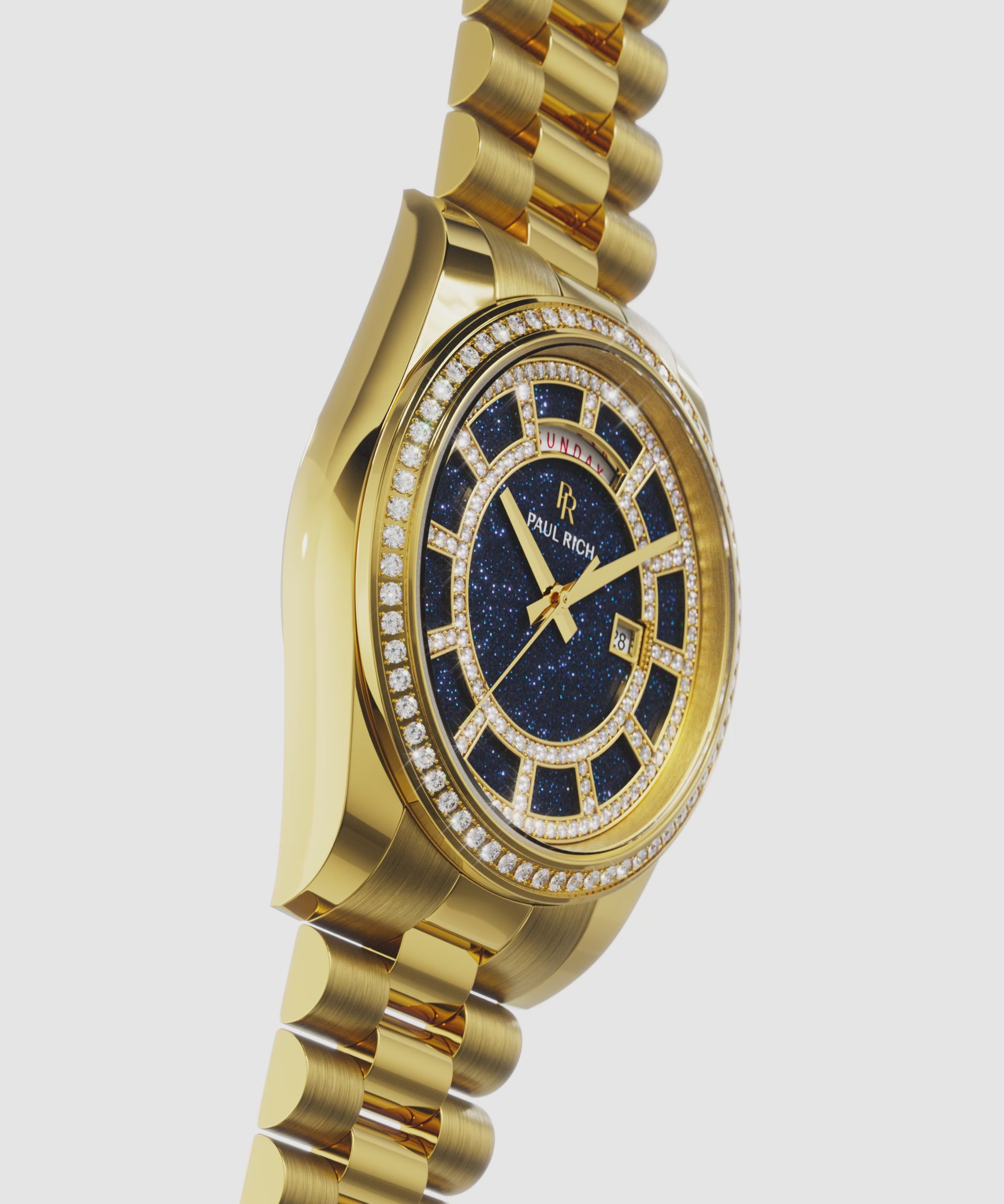 ![Gold watch with a blue aventurine dial, pavé diamond bezel, and day–date display shown on a wrist with a matching gold bracelet. product_visual, [lifestyle] Gold watch with a blue aventurine dial, pavé diamond bezel, and day–date display shown on a wrist with a matching gold bracelet. product_visual, [lifestyle]](http://paul-rich.eu/cdn/shop/files/12_3x4_website_1135x1362.png.jpg?v=1764072088)