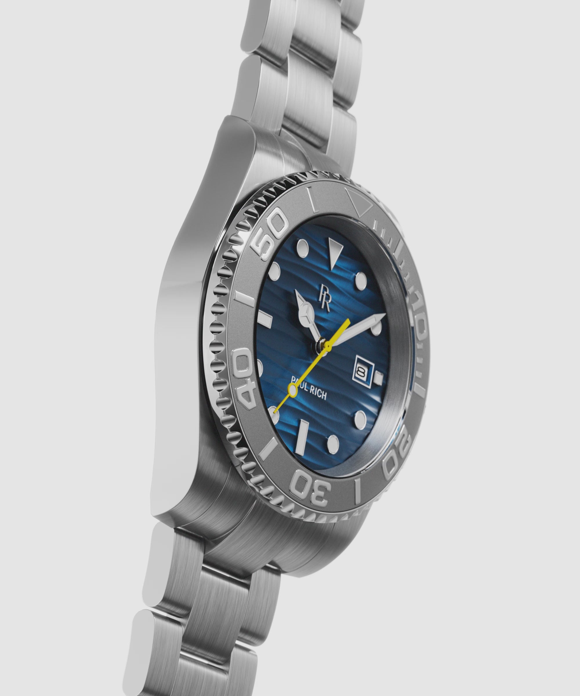 ![Stainless steel watch with a blue wave-textured dial and yellow seconds hand shown on a wrist, highlighting the bezel, markers, and brushed bracelet. [lifestyle] product_visual Stainless steel watch with a blue wave-textured dial and yellow seconds hand shown on a wrist, highlighting the bezel, markers, and brushed bracelet. [lifestyle] product_visual](http://paul-rich.eu/cdn/shop/files/AzureSeaWebsite2_224c36f8-1372-4bb4-9d0d-14fe85e3a16f_1135x1362.png.jpg?v=1765292506)