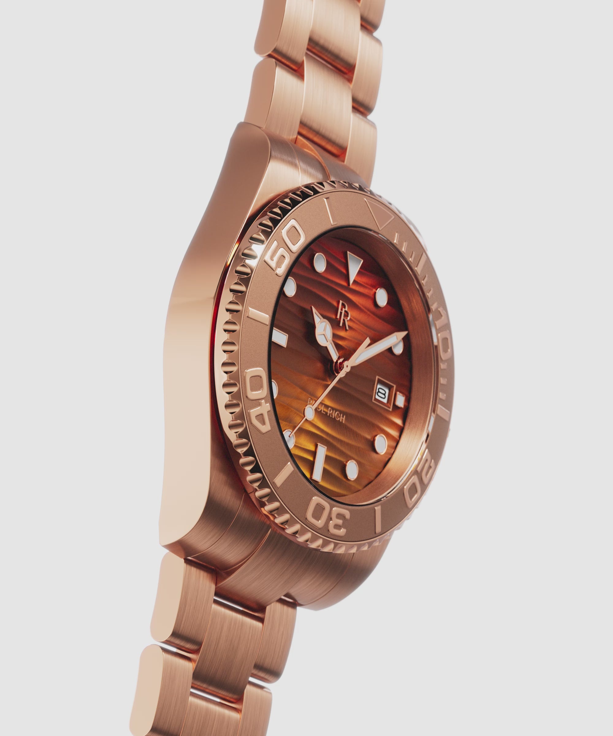 Meet the Crystal Bay – Sunset Beach. The stamped wave dial moves through warm oranges and reds as it hits the light, giving the watch a vivid, sunlit character that stands out instantly. A white seconds hand cuts across the gradient with crisp contrast, keeping the face clear and easy to read. The brushed rose-gold stainless steel case and bracelet add warmth without losing edge, while the unidirectional bezel brings real everyday utility with a smooth, confident turn. Clean hands and applied markers sit clearly over the textured dial for fast legibility. With 5 ATM water resistance and a solid, weighted feel, it wears like a serious daily watch. Bold color, clean lines, and effortless presence - built to look good anywhere.