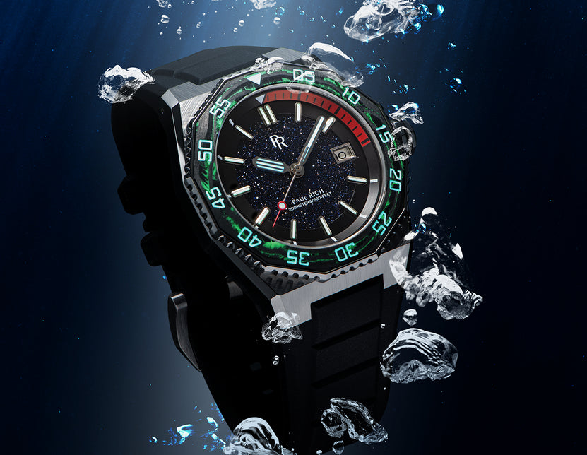 Tauchen Sie ein in Präzision und Zuverlässigkeit mit der Taucheruhr Aquacarbon Pro, die sowohl mit Quarz- als auch mit Automatikwerk erhältlich ist und über eine leuchtende Konstruktion aus geschmiedeter Kohlefaser und ein faszinierendes Aventurin-Zifferblatt verfügt. Diese Uhr wurde für Unterwassererkundungen entwickelt und verkörpert den Abenteuergeist, der für Paul Rich steht. Die leuchtende Lünette aus geschmiedeter Kohlefaser und die leuchtenden Akzente sorgen für optimale Sichtbarkeit und Funktionalität in Tiefen von bis zu 200 Metern. Ob mit dem zuverlässigen Schweizer Quarzwerk Ronda 505 oder dem robusten Seiko NH35A-Automatikwerk – die Taucheruhr Aquacarbon Pro ist Ihr ultimativer Begleiter, um die Tiefen mit Genauigkeit und Zuversicht zu erobern.