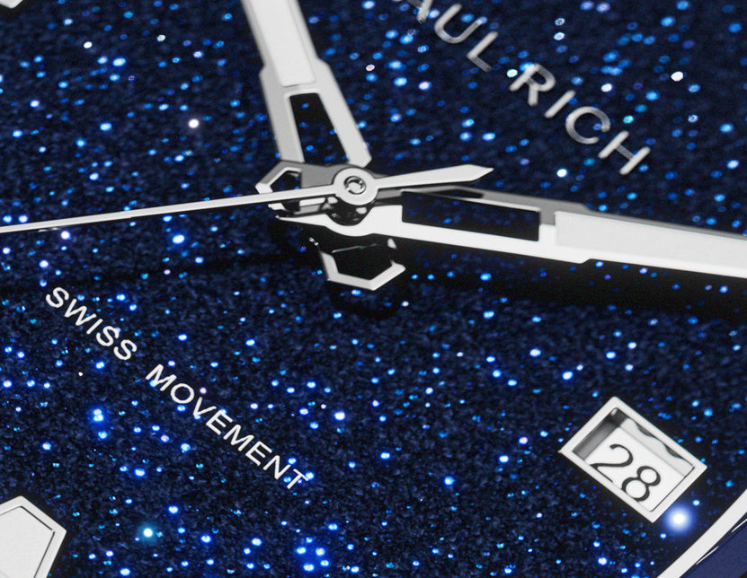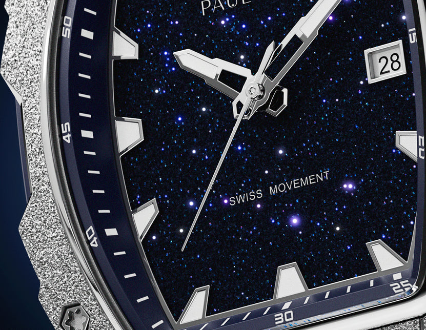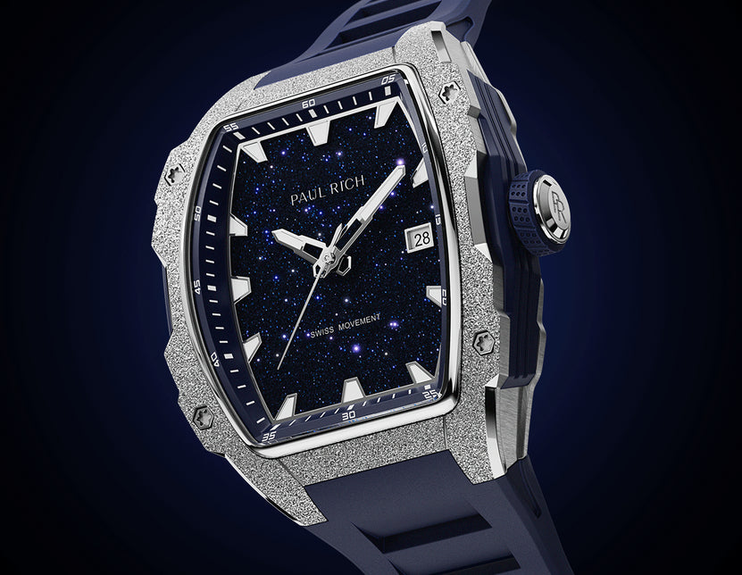 Wir präsentieren die Paul Rich Astro – ein tonnenförmiges, mattiertes Meisterwerk, das Stil und Innovation nahtlos miteinander verbindet. Sein Zifferblatt aus natürlichem Aventurinstein fängt die Essenz des Kosmos ein, während leuchtende Zeiger und Stundenmarkierungen für hervorragende Sichtbarkeit bei Tag und Nacht sorgen.