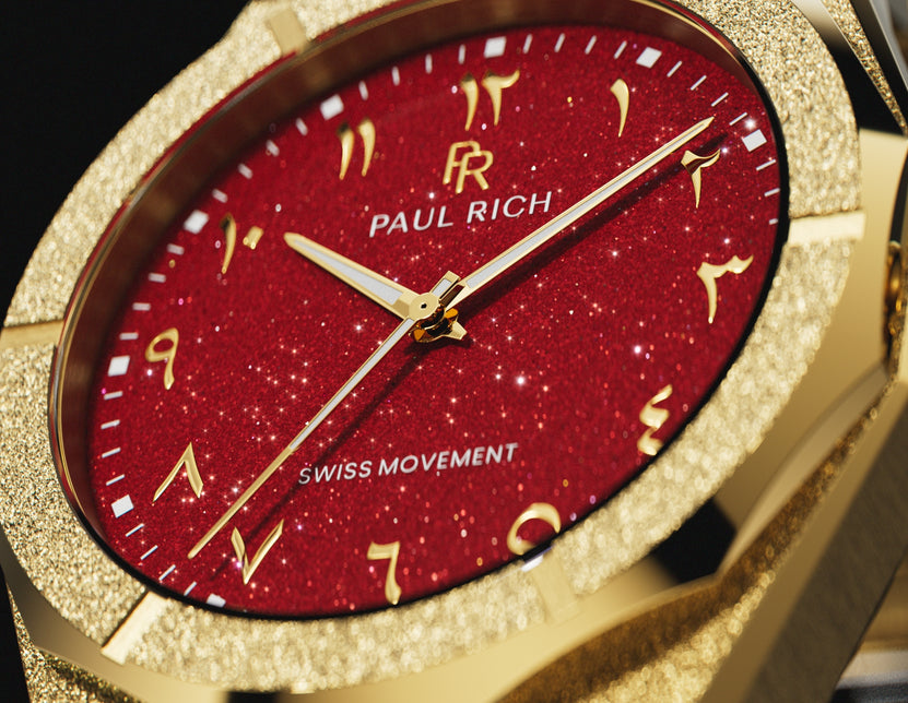 Entdecken Sie die Verschmelzung kosmischer Eleganz und arabischen Erbes mit Paul Richs Frosted Star Dust Special Arabic Edition. Diese luxuriöse Uhr verfügt über ein Zifferblatt mit Galaxienmotiv und arabischen Ziffern, die die unschätzbaren Beiträge der arabischen Welt zur Mathematik und Astronomie symbolisieren. Die in robustes Edelstahl eingefasste Uhr kombiniert Haltbarkeit mit einem schimmernden mattierten Finish, das an einen sternenklaren Nachthimmel erinnert. Sie ist mehr als eine Uhr, sie ist ein tragbares Zeugnis der Erhabenheit der arabischen Kultur und vereint Stil, Geschichte und Stolz in jedem Detail. Tragen Sie ein Stück arabisches Erbe an Ihrem Handgelenk und navigieren Sie mit dieser luxuriösen Uhr durch Ihren Tag.