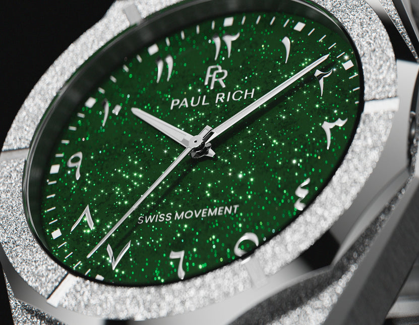 Entdecken Sie die Verschmelzung kosmischer Eleganz und arabischen Erbes mit Paul Richs Frosted Star Dust Special Arabic Edition. Diese luxuriöse Uhr verfügt über ein Zifferblatt mit Galaxienmotiv und arabischen Ziffern, die die unschätzbaren Beiträge der arabischen Welt zur Mathematik und Astronomie symbolisieren. Die in robustes Edelstahl eingefasste Uhr kombiniert Haltbarkeit mit einem schimmernden mattierten Finish, das an einen sternenklaren Nachthimmel erinnert. Sie ist mehr als eine Uhr, sie ist ein tragbares Zeugnis der Erhabenheit der arabischen Kultur und vereint Stil, Geschichte und Stolz in jedem Detail. Tragen Sie ein Stück arabisches Erbe an Ihrem Handgelenk und navigieren Sie mit dieser luxuriösen Uhr durch Ihren Tag.