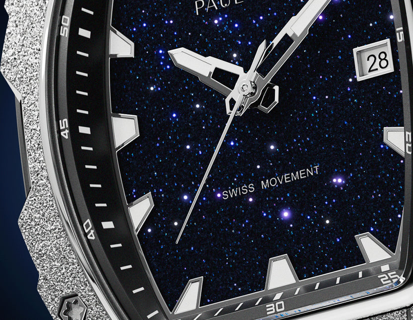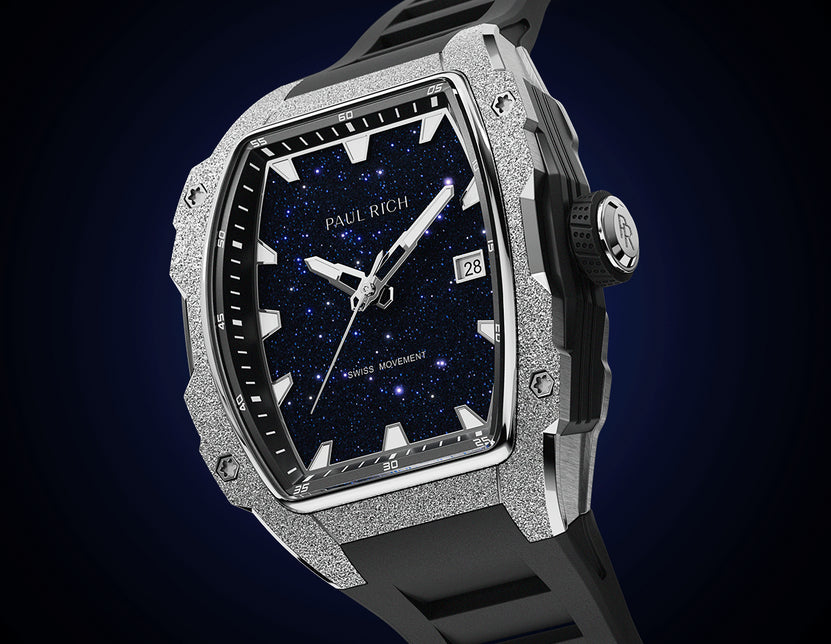 Présentation du Paul Rich Astro, un chef-d'œuvre givré en forme de tonneau alliant harmonieusement style et innovation. Son cadran en pierre d'aventurine naturelle capture l'essence du cosmos, tandis que les aiguilles et index lumineux assurent une visibilité exceptionnelle, de jour comme de nuit.